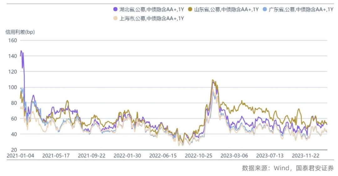 图3:上海、广东及其他部分发达地区短久期公募城投债信用利差变动情况(2021-01至2024-02)