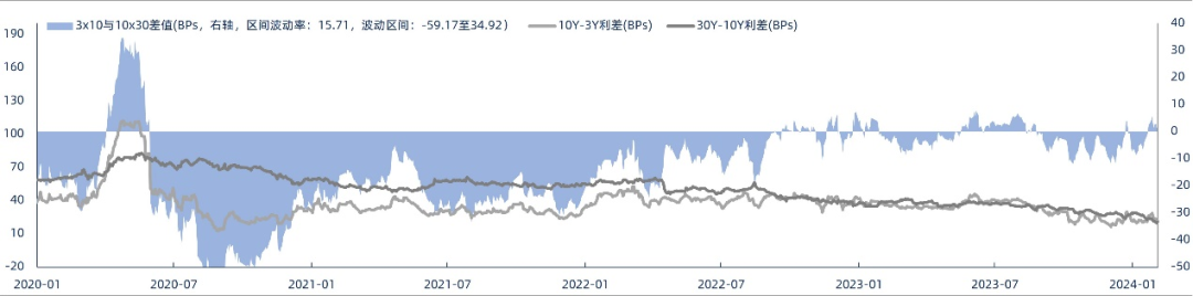 图4:3年期、10年期和30年期国债利差走势(2020-01至2024-02)