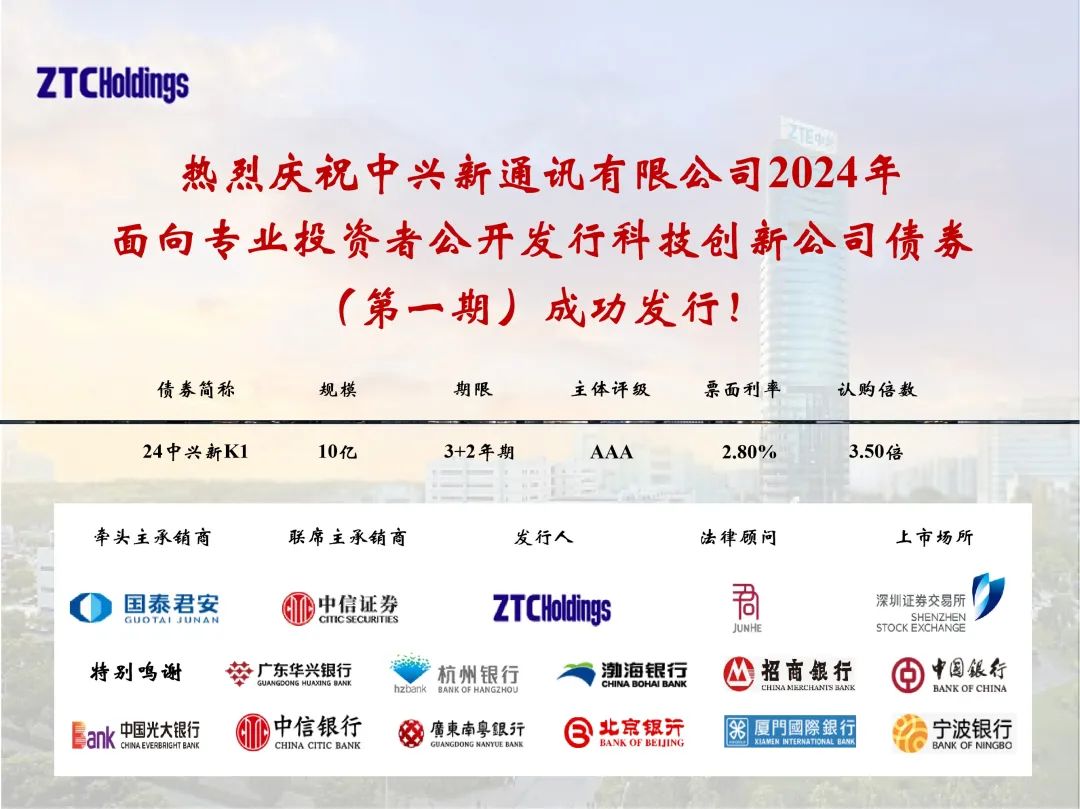 近日,由国泰君安担任牵头主承销商的中兴新通讯有限公司2024年面向专业投资者公开发行科技创新公司债券(第一期)(债券名称:24中兴新K1,债券代码:148594.SZ)在深圳证券交易所成功簿记发行。本期债券系中兴新通讯在交易所市场的首次亮相。