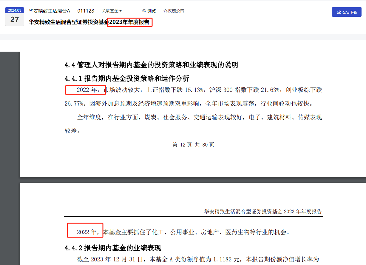 华安基金旗下产品华安精致生活公布的年报也引发了一波关注和吐槽。由于在2023年年报大篇幅提到2022年的事情,如“2022年市场波动较大,上证指数下跌15.13%,沪深300指数下跌21.63%,创业板综下跌26.77%。因海外加息预期及经济增速预期双重影响,全年市场表现震荡,行业间轮动也较快”“2022年本基金主要抓住了化工、公用事业、房地产、医药生物等行业的机会”,随后被网友扒出上述内容早在2022的年报中就已经出现过。有投资者认为,撰写报告是基金经理分内之事,完全照搬照抄完全是对投资者权益的一种极度敷衍和漠视,华安基金的内审制度明显存在漏洞。