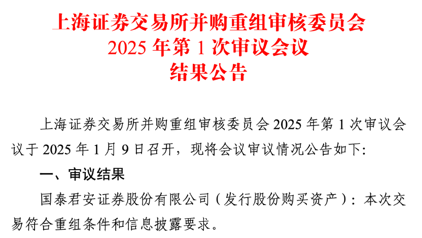 “国君+海通”成功过会!1月9日晚间,上海证券交易所并购重组审核委员会发布公告称,国泰君安发行股份购买资产的交易符合重组条件和信息披露要求。目前,“国君+海通”合并重组“进度条”已更新至获重组委会议通过。