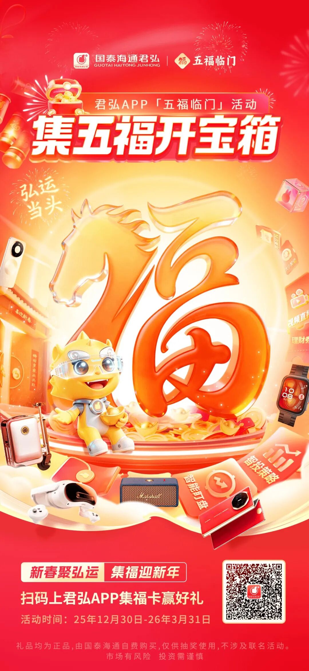 为满足客户日益高涨的资产配置需求,践行“金融为民”初心与使命,值此马年新春,国泰海通打造“2026五福临门”活动,推出资产配置专业服务,陪伴投资者开启财富新程。本届活动将专业资产配置服务与新春主题深度融合,以数字平台为载体、场景服务为纽带,将国泰海通财富管理优势服务转化为客户可感知、可参与的温暖实践,为4000万客户献上一份承载美好祝愿与财富智慧的五福新年礼。