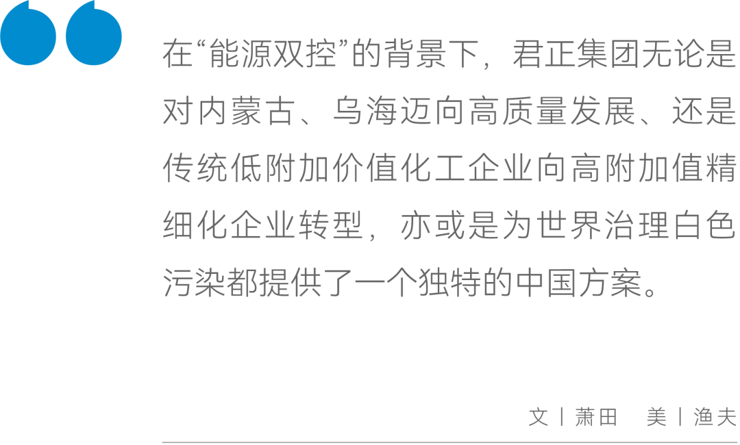 如今,在“能源双控”的背景下,君正集团在“绿”上谋转型,“链”上谋发展,不仅为内蒙古、乌海迈向高质量发展提供了一次完美助攻,也为传统低附加价值化工企业向高附加值精细化企业转型,提供了一个全新的循环经济视角。