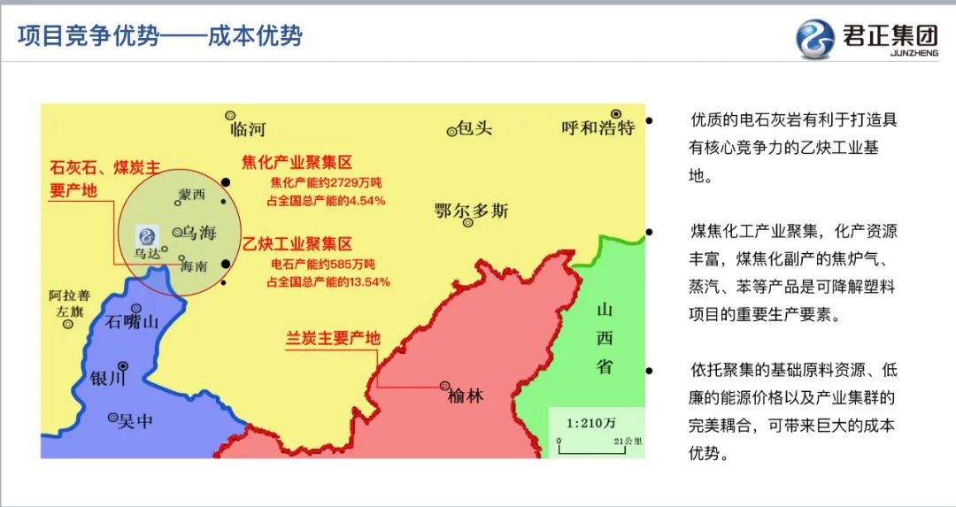 君正集团的可降解塑料循环项目坐落于内蒙古乌海市,得益于得天独厚的资源优势,当地已经形成了“煤化工”和“乙炔化工”两个具有明显区域性竞争优势的产业集群,可降解塑料项目是基于这一产业优势上“两化高度耦合”的产物,由此也带来了产能和成本优势。