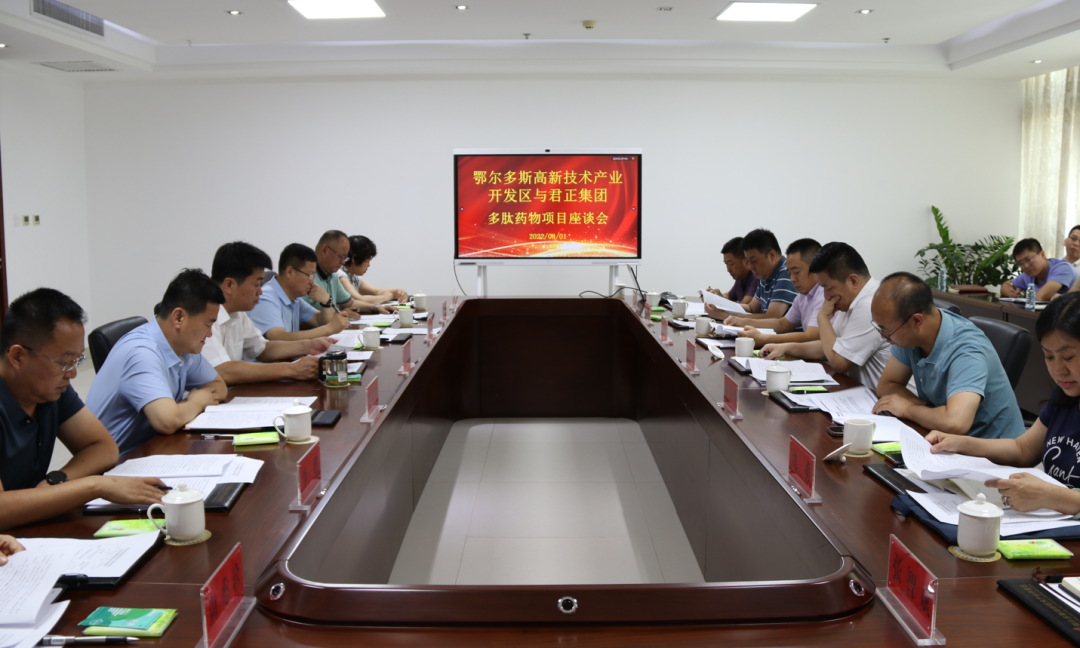 8月1日,高新区党工委书记、东胜区委书记高屹东,党工委副书记、管委会主任张鹏程与君正集团董事局主席杜江涛,中山大学教授、博导蒋先兴一行就推进超长效多肽药物研发转化项目合作举行座谈。