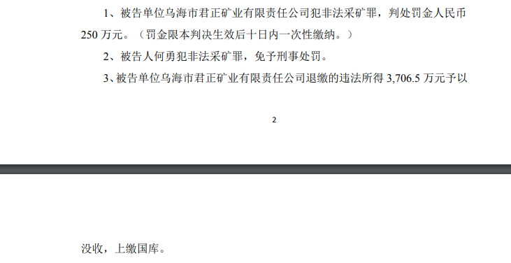 因此,法院一审判决,君正矿业犯非法采矿罪,判处罚金人民币250万元;何勇犯非法采矿罪,免予刑事处罚。同时,君正矿业退缴的违法所得3706.5万元予以没收,上缴国库。
