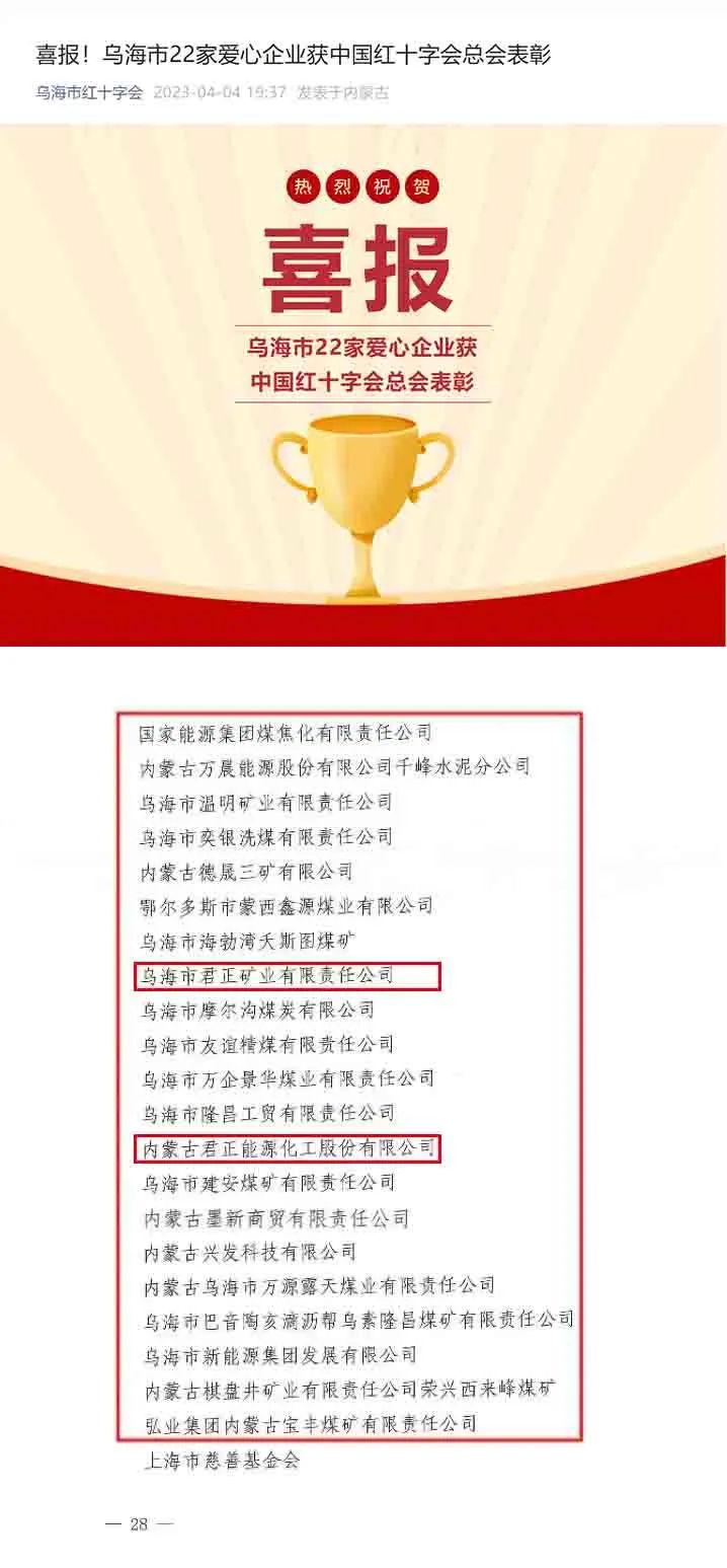 近日,中国红十字会总会印发《关于授予2022年度为中国红十字事业做出突出贡献的捐赠人奖章奖牌的通报》,乌海市22家爱心企业被表彰,君正集团占两席。内蒙古君正能源化工集团股份有限公司和乌海市君正矿业有限责任公司被授予中国红十字奉献奖章。