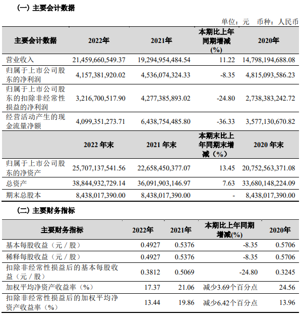 据报告显示,报告期内,公司实现营业收入214.60亿元,同比增长11.22%;归属于上市公司股东的净利润41.57亿元,同比减少8.35%;归属于上市公司股东的扣除非经常性损益的净利润32.17亿元,同比减少24.80%。报告期末,公司资产总额 388.45亿元,同比增长7.63%。