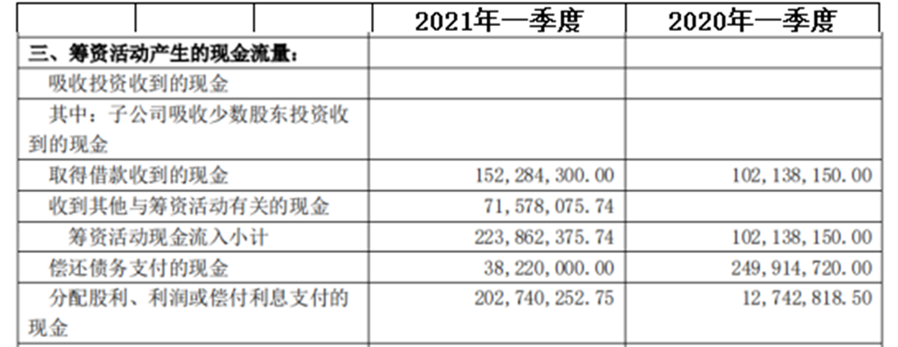 除此之外,吉鑫科技账面还存在大额借款。吉鑫科技受累于此,一季度为偿还债务而支付的现金就高达3822万元。值得注意的是,截至一季度末,吉鑫科技账面还留有高达3.23亿元的短期借款,其面临的偿债压力依旧严峻。
