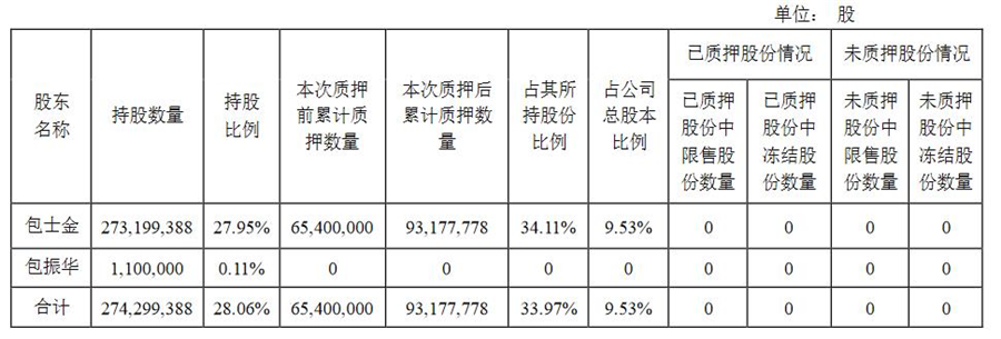 华夏能源网(www.hxny.com)获悉,5月31日,吉鑫科技(SH:601218)发布公告称,接到公司大股东包士金函告,其已将所持部分股份进行了质押。据了解,包士金本次质押的股份数量达2778万股,占公司总股本的2.84%,股份质押期从2021年3月19日起,到2022年3月18日止。随着包士金股份质押的完成,其累计质押的股份数量已达9318万股,占公司总股本达9.53%。