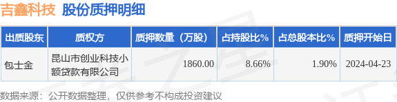 吉鑫科技(601218)4月26日公开信息显示,股东包士金向昆山市创业科技小额贷款有限公司合计质押1860.0万股,占总股本1.9%。质押详情见下表: