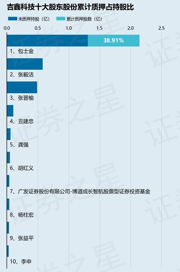 截止本公告日,股东包士金已累计质押股份8360.0万股,占其持股总数的38.91%。本次质押后吉鑫科技十大股东的累计质押股份占持股比例见下图: