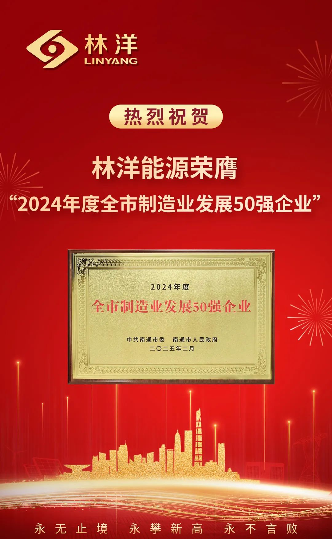 近日,南通市新型工业化暨重大项目建设推进大会顺利召开。江苏林洋能源股份有限公司凭借卓越的创新实力与全球化高质量发展成效,成功入选"2024年度全市制造业发展50强企业",成为南通制造业转型升级的标杆企业。