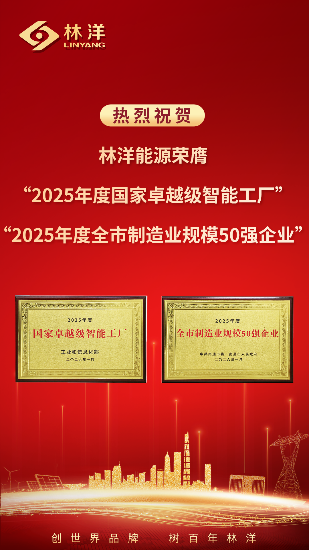 1月19日,南通市召开新型工业化推进会暨“AI+制造”创新发展会议,谋划新时期发展蓝图。会上对2025年度为工业经济作出突出贡献的企业予以通报表扬。林洋能源凭借在智能制造与规模发展方面的扎实成果,获评“2025年度国家卓越级智能工厂”与“2025年度南通市制造业规模50强企业”两项荣誉。