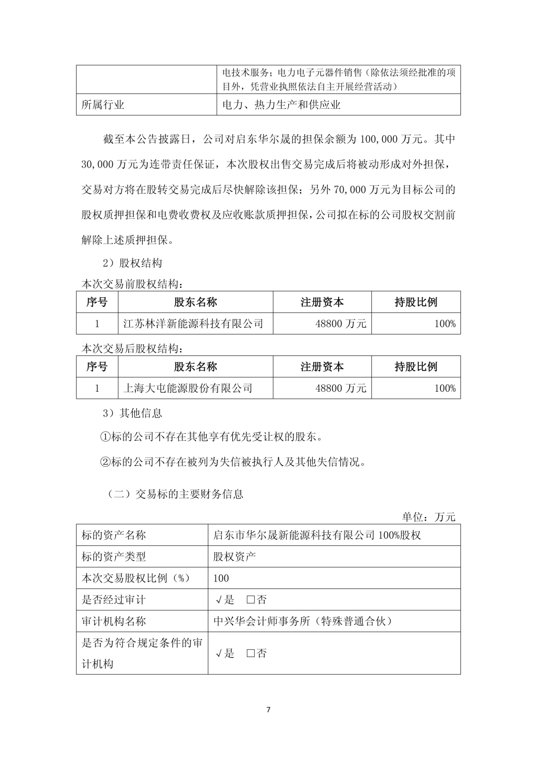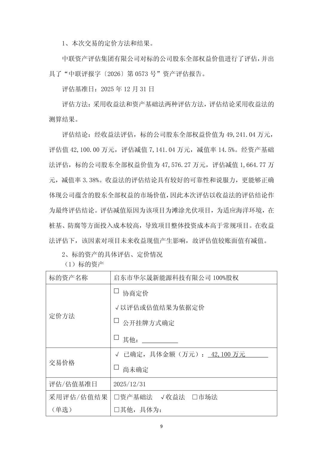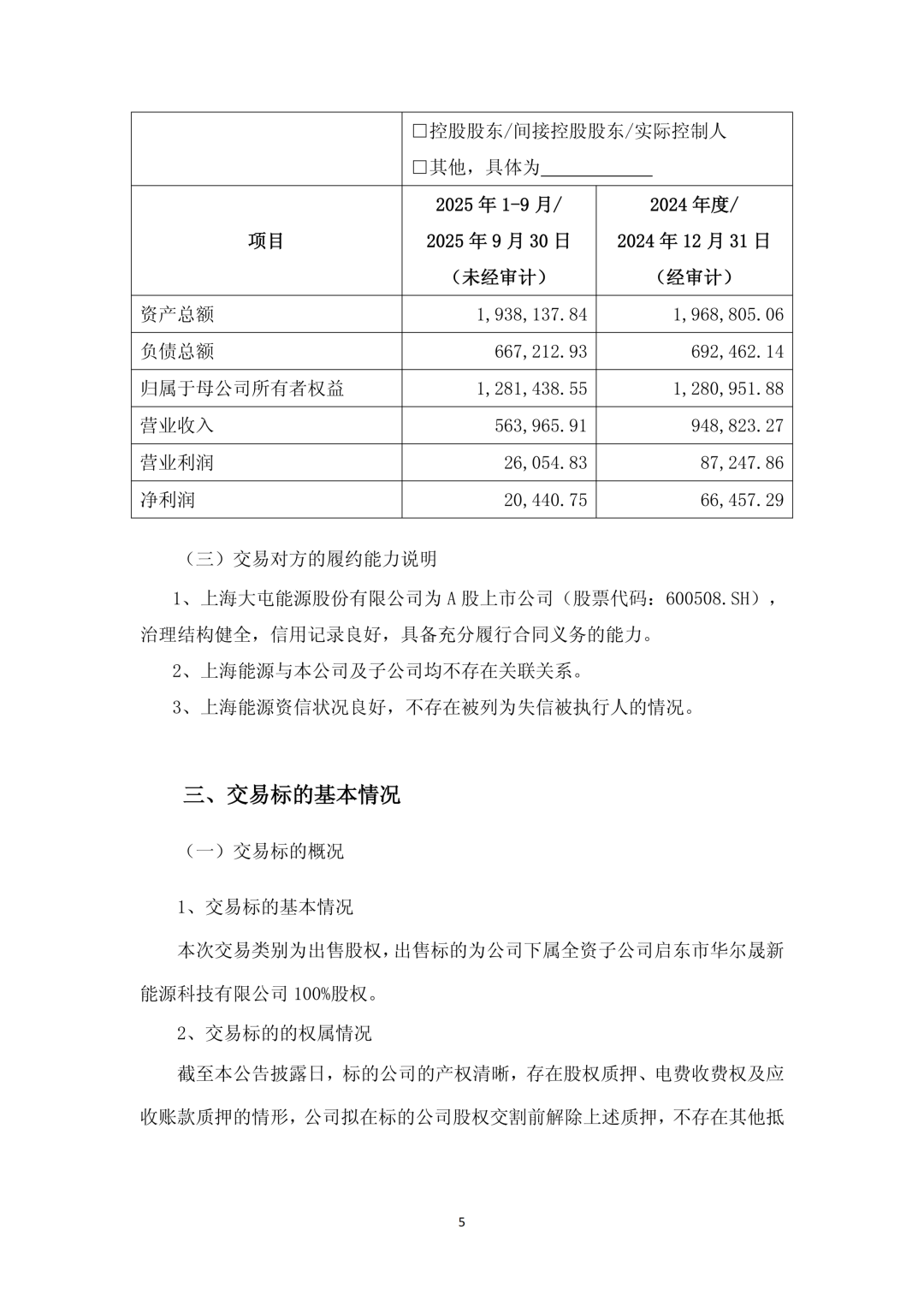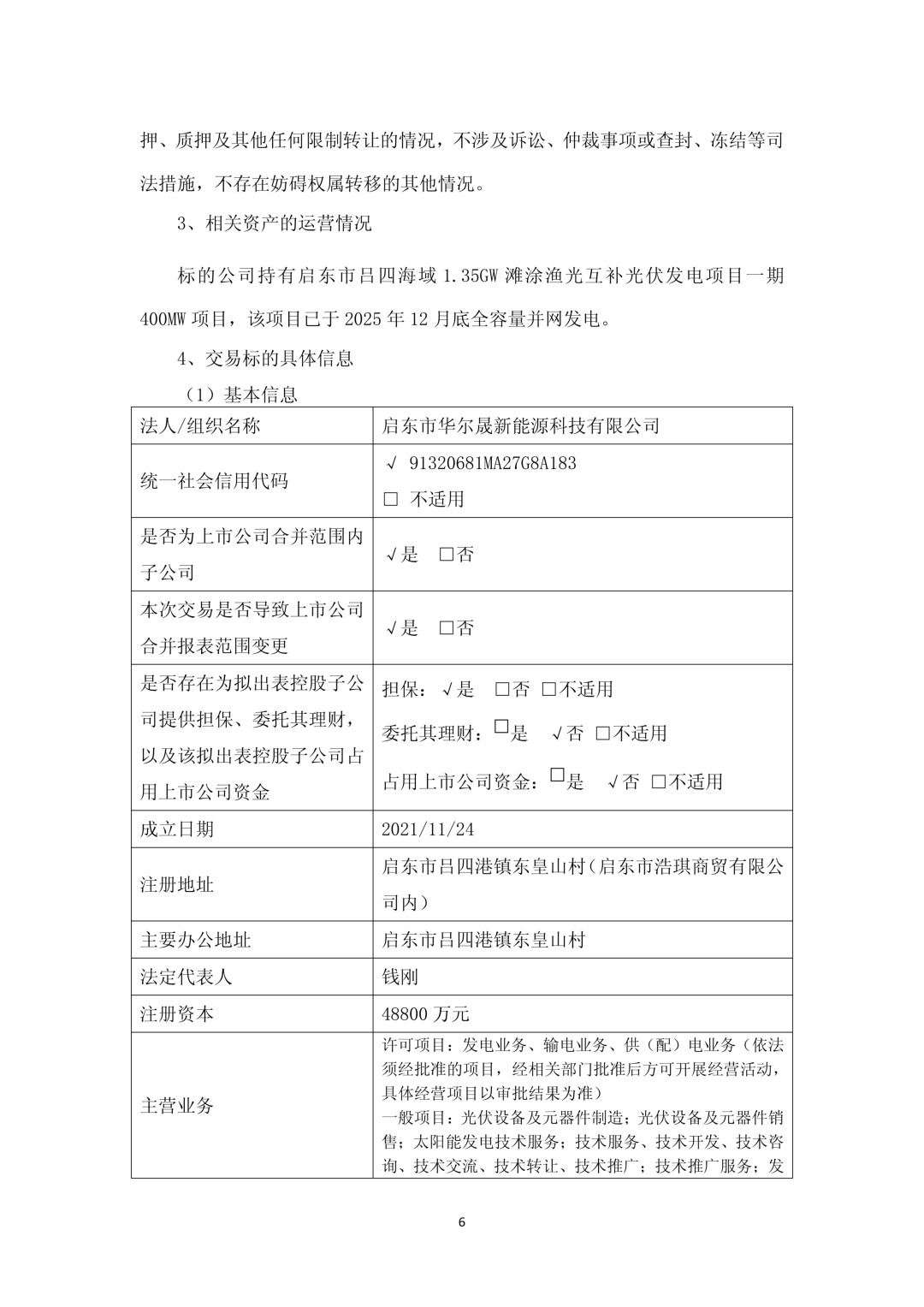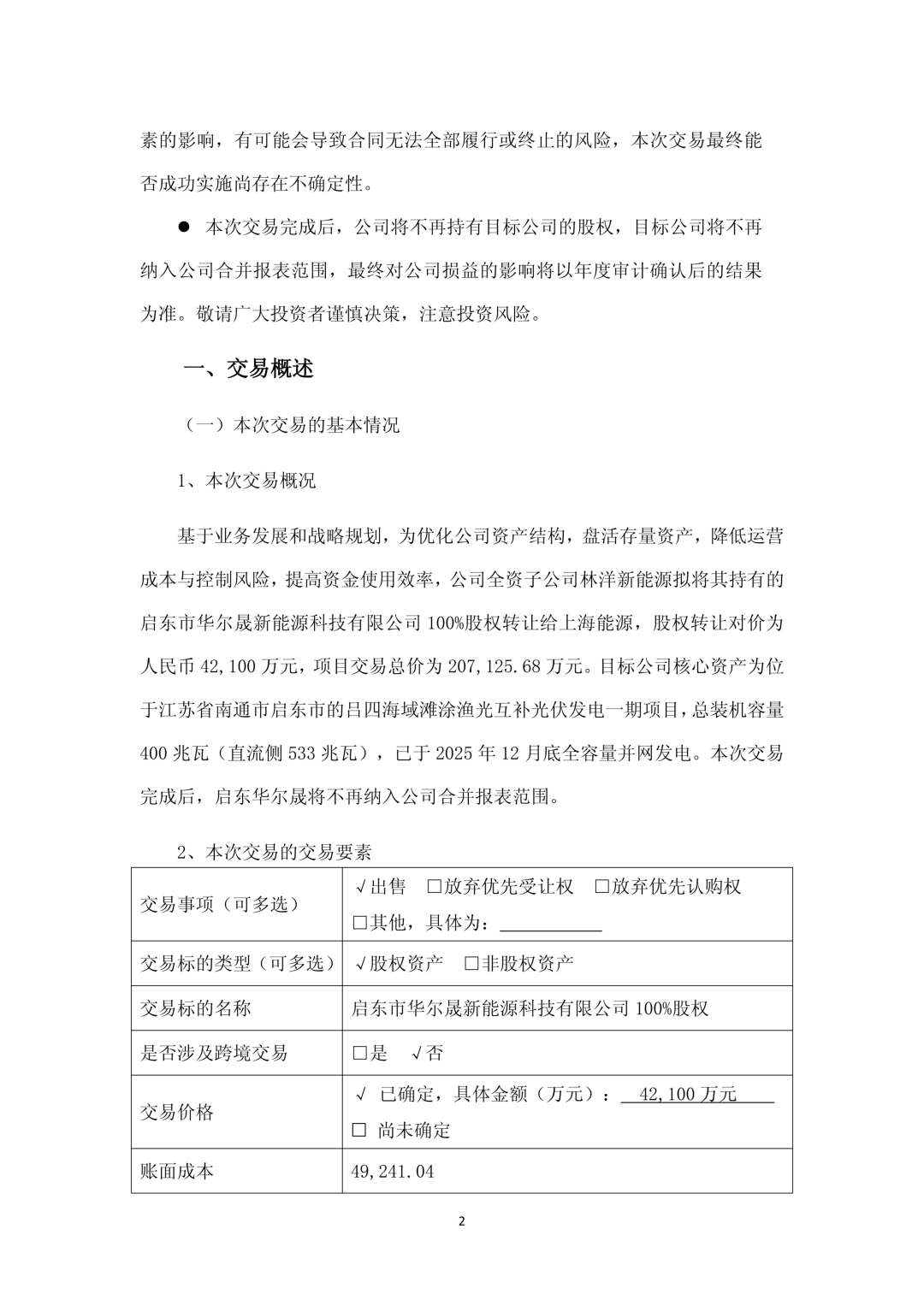 根据公告,林洋新能源拟将其持有的启东市华尔晟新能源科技有限公司100%股权转让给上海能源,股权转让对价为人民币42,100万元,项目交易总价为207,125.68万元。目标公司核心资产为位于江苏省南通市启东市的吕四海域滩涂渔光互补光伏发电一期项目,总装机容量400兆瓦(直流侧533兆瓦),已于2025年12月底全容量并网发电。