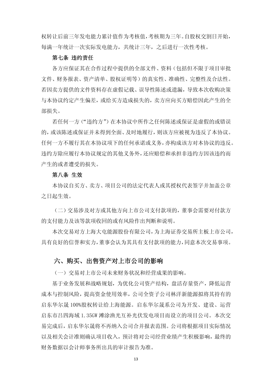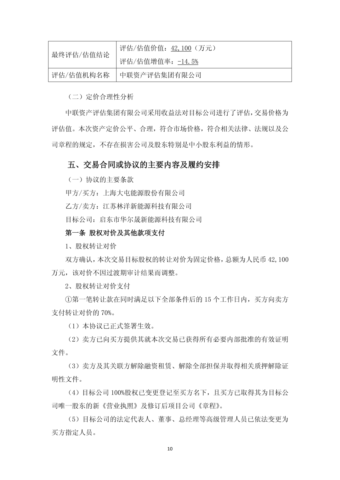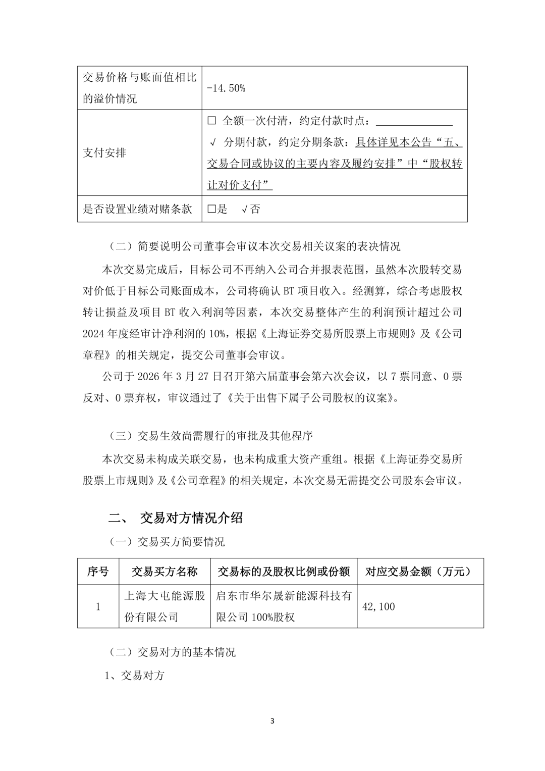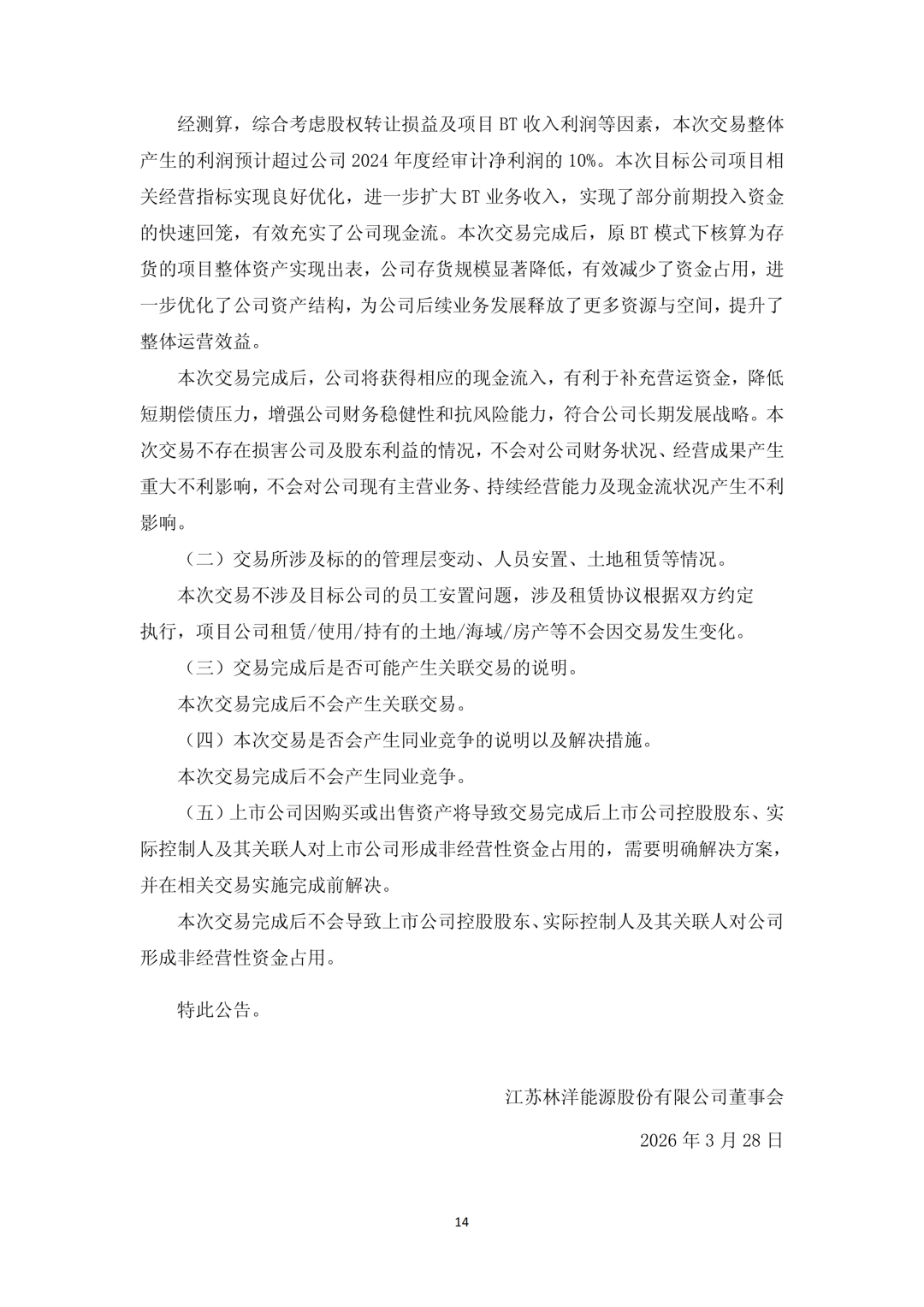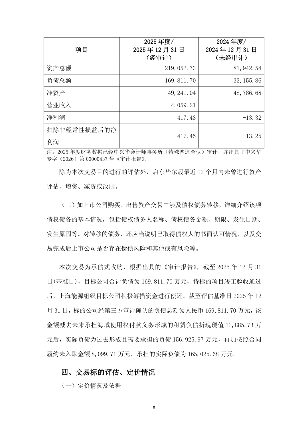 根据公告,林洋新能源拟将其持有的启东市华尔晟新能源科技有限公司100%股权转让给上海能源,股权转让对价为人民币42,100万元,项目交易总价为207,125.68万元。目标公司核心资产为位于江苏省南通市启东市的吕四海域滩涂渔光互补光伏发电一期项目,总装机容量400兆瓦(直流侧533兆瓦),已于2025年12月底全容量并网发电。