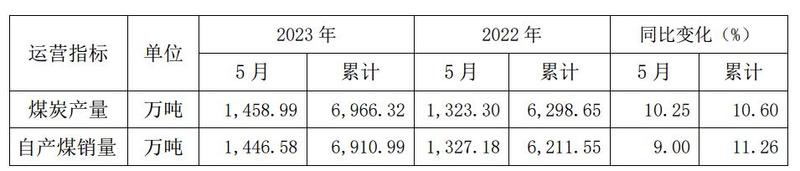 陕西煤业6月8日公告了5月主要运营数据,2023年5月煤炭产量1458.99万吨,同比增长10.25%;5月自产煤销量1446.58万吨,同比增长9%。前5月煤炭产量累计6966.32万吨,同比上涨10.6%;前5月自产煤销量6910.99万吨,同比增长11.26%。
