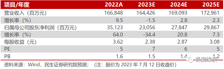 考虑到公司2022年度利润受非经常性损益影响较大,我们预计公司2023-2025年归母净利润分别为230.56/278.47/298.67亿元,对应EPS分别为2.38/2.87/3.08元/股,对应7月12日收盘价的PE分别为7/6/5倍,维持“推荐”评级。