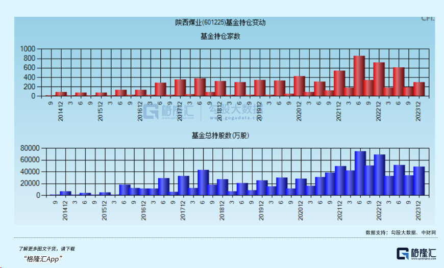 此外,国内公募基金持股陕西也维持在最近几年相对高位。不过,截止2023年末,持股陕煤股数48137万股,较三季度环比提升14227万股,但相较于2022Q2的74613万股下滑55%。