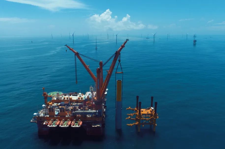 面对施工船舶“一船难求”的困境,公司加大资源投入,先后引进华电中集01、振江号等施工船舶,率先成功应用半潜式重吊船完成大直径单桩沉桩作业,最小垂直度达到0.17‰,高质量完成了基础施工。针对风电机组新机型积极探索安装工艺,设计制造辅助工装,增加风机吊索具,施工效率从开始四天一台到45小时内完成单台风机全过程安装。