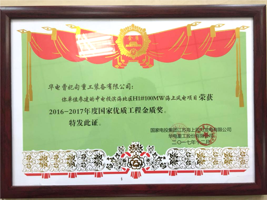 2018年1月13日,曹妃甸重工参建的国家电投滨海北区H1#100MW海上风电项目荣获2016-2017年度国家优质工程金奖,成为国内风电工程(陆上、海上)首个荣获国家优质工程金质奖项目。国家电投滨海北区H1#100MW海上风电项目是曹妃甸重工参建的第一个海上风电项目,该项目单机容量4MW,其中塔筒最大直径5.5m,基础桩基最大直径6.4m,重720T,该项目已经于2016年成功并网发电。