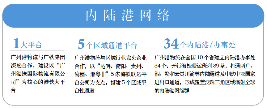 凭借国家铁路网络通道优势,物流公司以南沙港铁路为抓手,打造“1大平台+5个小区域通道平台+34个办事处”的专业化经营主体,通过构建港铁大平台,成功衍生“昆明、衡阳、贵州、渝穗、湘粤非”5个区域性或国际性通道平台,依托泛珠三角地区的34个内陆港和办事处,开行39条辐射内陆班列线路,有力提升广州港海铁联运品牌竞争力。