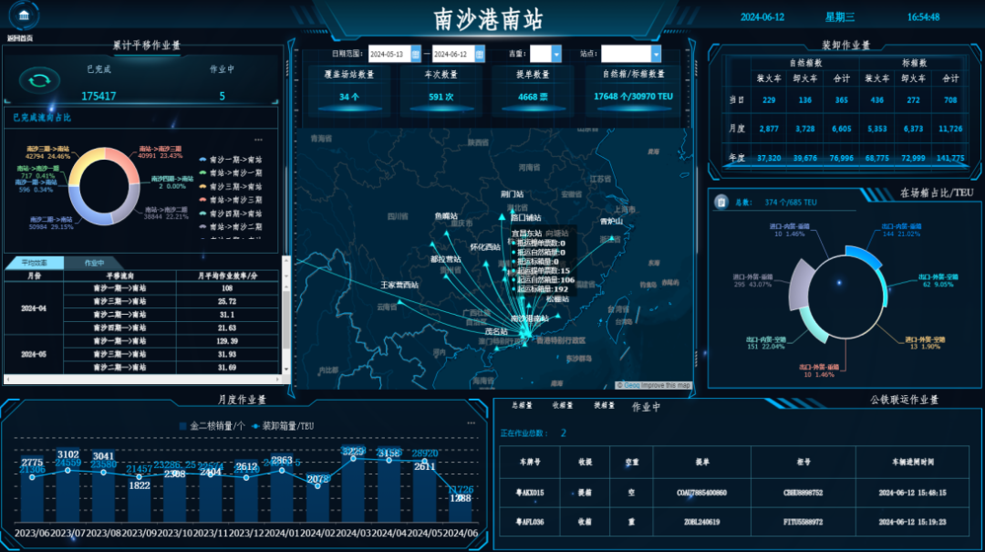 自接管运营南站以来,广州港物流海铁联运量屡创新高,港站一体化运营模式优势明显,推动南沙港区海铁联运高效衔接,助力运输结构调整,进一步降低社会物流成本。广州港通过港站一体化带动南沙港区集装箱码头货源增量达11.5万TEU,实现高速增长。2023年,南站海铁联运量同比增长241.7%,助力全港海铁联运量同比增长73%。2024年,南站海铁联运量同比增长47.16%,助推全港海铁联运量同比增长38.83%。