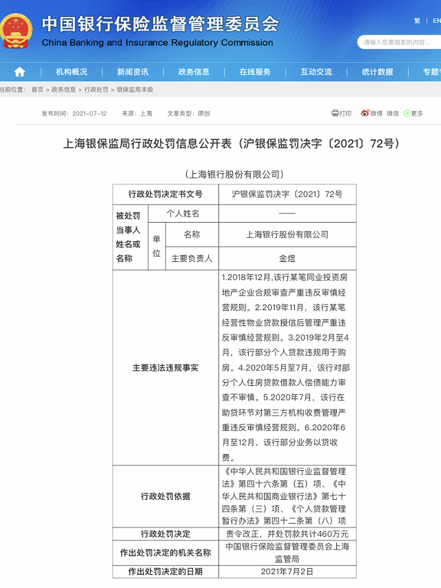 根据《中华人民共和国银行业监督管理法》第四十六条第(五)项、《中华人民共和国商业银行法》第七十四条第(三)项、《个人贷款管理暂行办法》第四十二条第(八)项,上海银保监局责令上海银行改正,并对其处以罚款共计460万元。