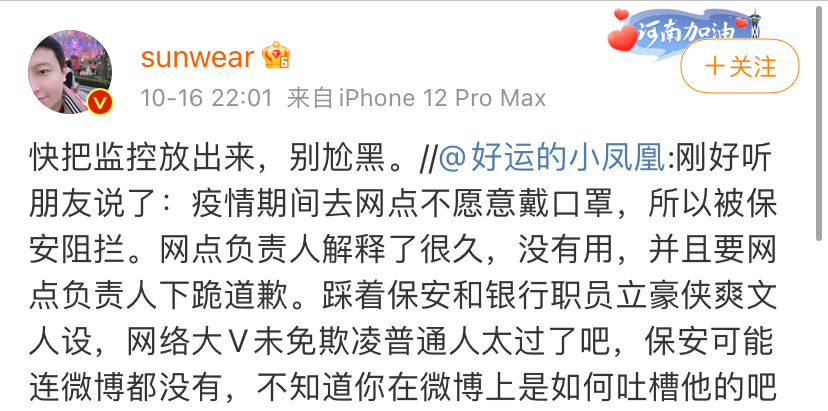 这篇博文引起网友热议,有人指出,最初是因上述博主不愿戴口罩才引起保安阻拦:“刚好听朋友说了:疫情期间去网点不愿意戴口罩,所以被保安阻拦。网点负责人解释了很久,没有用,并且要网点负责人下跪道歉。踩着保安和银行职员立豪侠爽文人设,网络大V未免欺凌普通人太过了吧,保安可能连微博都没有,不知道你在微博上是如何吐槽他的吧。”