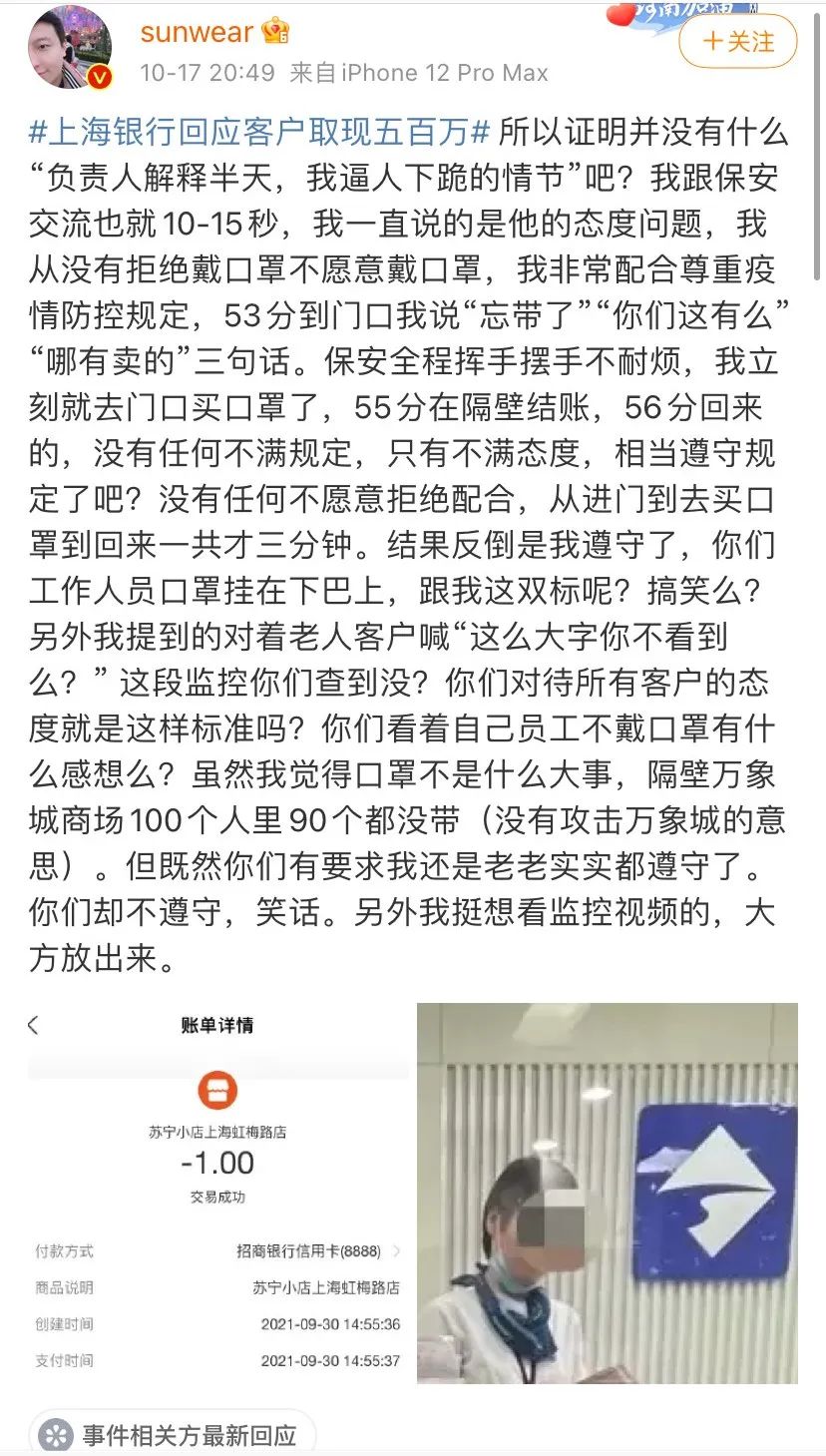 10月16日,大V怒怼上海银行!服务太差,一气之下取现金500万,点钞就要2小时!冲上热搜,10月17日,上海银行回应此事,称网点人员未违反服务要求,此事起因为:因客户未佩戴口罩,网点保安按照防疫要求,示意客户佩戴口罩后再进入网点。