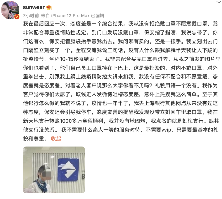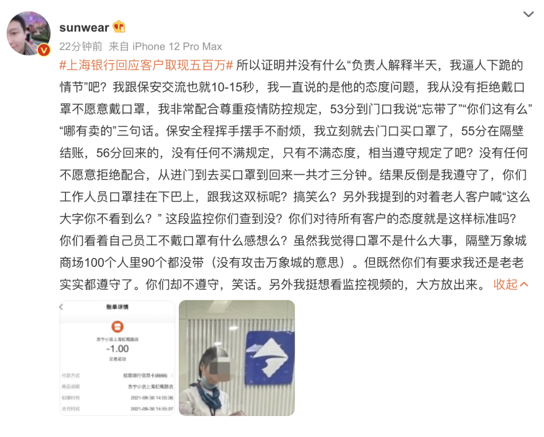 在上海银行作出官方回应当晚,微博大V@sunwear 也就此在微博再度喊话:“我挺想看监控视频的,大方放出来”。