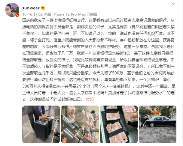 “国庆前我去了一趟上海银行虹梅支行,这是我有史以来见过服务态度意识最差的银行”,sunwear表示,并称其在该行存了几千万,近一年银行流水接近4亿,由于上海银行的服务态度问题,他决定把储存在该行的几千万元都取出来转存他行,并于10月16日一次性取出现金500万元。