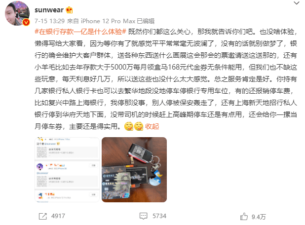 此前也曾参与#在银行存款一亿是什么体验#等话题讨论,也是包含招商银行、上海银行在内的多家银行私行客户。