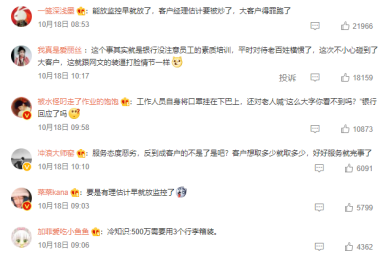 10月17日,上海银行公开回应称,该行已第一时间通过调阅监控录像,询问相关人员等方式进行了核查,并表示“我行网点人员并未违反银行服务要求”,此话一出,引发了议论更为热烈的讨论。绝大部分网友都站在客户这边,对上海银行的回应并不买账,没有认真反思自身存在的问题。