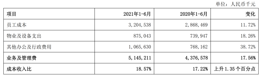 费用方面,上海银行业务及管理费增长近2成,报告期内,其发生业务及管理费51.45亿元,同比增长7.69亿元,增幅17.56%。其中,其他及行政办公费用增幅最高,将近4成,具体什么原因造成,财报并未进一步披露,而增幅如此高的办公及行政费用,上海银行未来还是需要考虑如何压降成本。