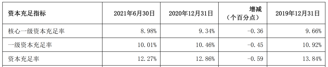 2021年上半年,该行资本充足率为12.27%,一级资本充足率为10.01%核心一级资本充足率为8.98%,较上年末分别下降了0.59、0.45、0.36个百分点,实际上自2019年该行的资本充足指标就开始下降,如果不及时补充资本,持续的资本消耗,必将会限制业绩的增长。