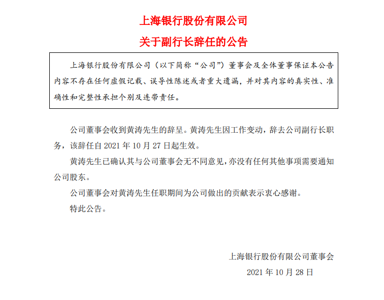 昨日,上海银行发布公告称,黄涛因工作变动,辞去公司副行长职务,该辞任自2021年10月27日起生效。