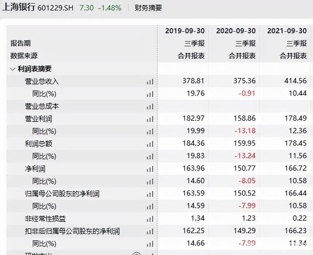 财报显示,2021年第三季度,上海银行(601229)营收137.5亿元,同比增长13.4%;归属母公司股东的净利润43.66亿元,增长11.4%;前三季度,实现收入414.6亿元,增长10.4%,净利润166.4亿元,增长10.6%。