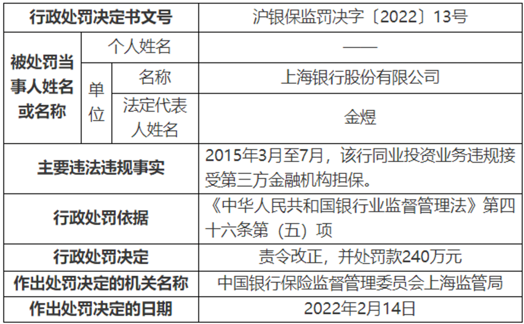 罚单信息显示,2015年3月至7月,该行同业投资业务违规接受第三方金融机构担保。根据《中华人民共和国银行业监督管理法》第四十六条第(五)项,上海银保监局责令该行改正,并处罚款240万元。