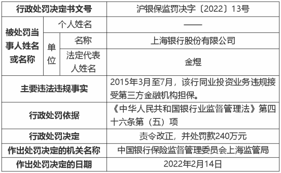 值得一提的是,此次上海银行被罚涉及的主要违法违规事实,为该行发生在7年前的同业投资业务违规。罚单信息显示,2015年3月至7月,上海银行同业投资业务违规接受第三方金融机构担保。
