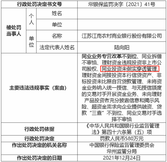 行长助手注意到,根据银保监会本月11日公布的处罚信息,因存在12项违法违规事实,江苏江南农商行被常州银保监分局罚款580万元。其中在同业投资违规的部分,江南农商行涉及的是同业投资未做实穿透管理。