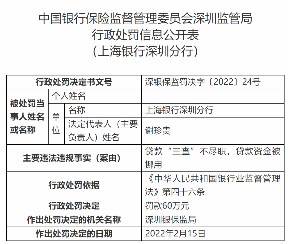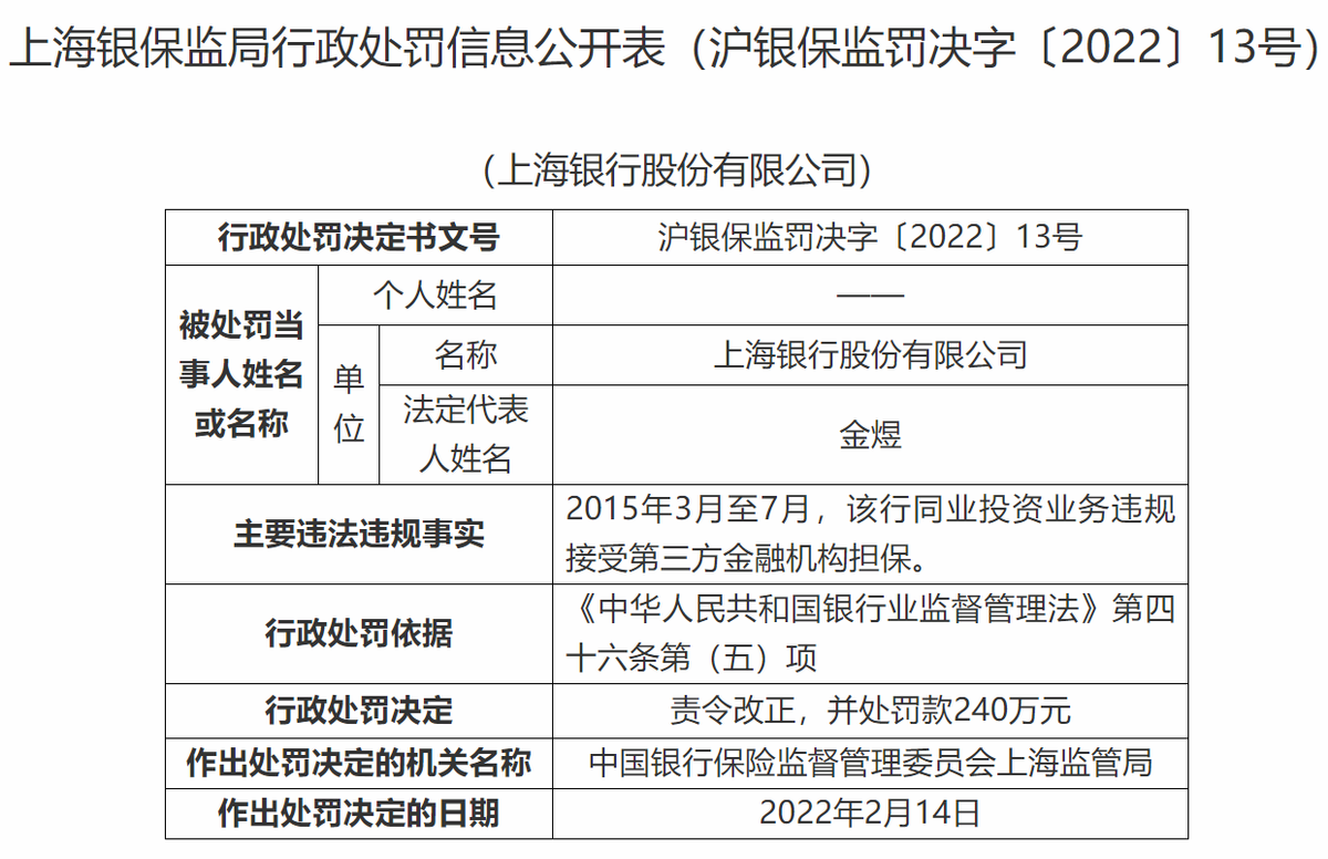 银保监会官网显示,上海银行2月23日因“2015年3月至7月,同业投资业务违规接受第三方金融机构担保”被处罚金240万元。隔日,该行又因“贷款‘三查’不尽职,贷款资金被挪用”被罚款60万元。