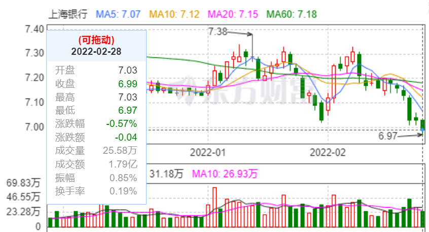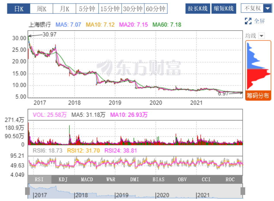 公开资料显示,上海银行成立于1995年12月29日,并于2016年11月16日登陆上交所主板,股票发行价为每股17.77元。截至2月28日,上海银行收盘价报6.99元每股,较前一日下跌0.57%,并且一度低至6.97元每股。而上海银行上市那天的收盘价为每股25.59元,这就意味着,从上市至今,该行股价已跌去72.68%。