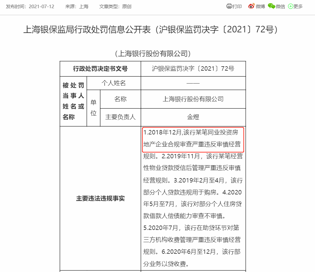 值得一提的是,其中两笔逾百万罚单都涉及同业投资违规。比如2021年7月,上海银行因6项违规被罚460万元。第1项违规事由即为:“2018年12月,该行某笔同业投资房地产企业合规审查严重违反审慎经营规则”。与此同时,这也是该行2021年以来收到的最大罚单。