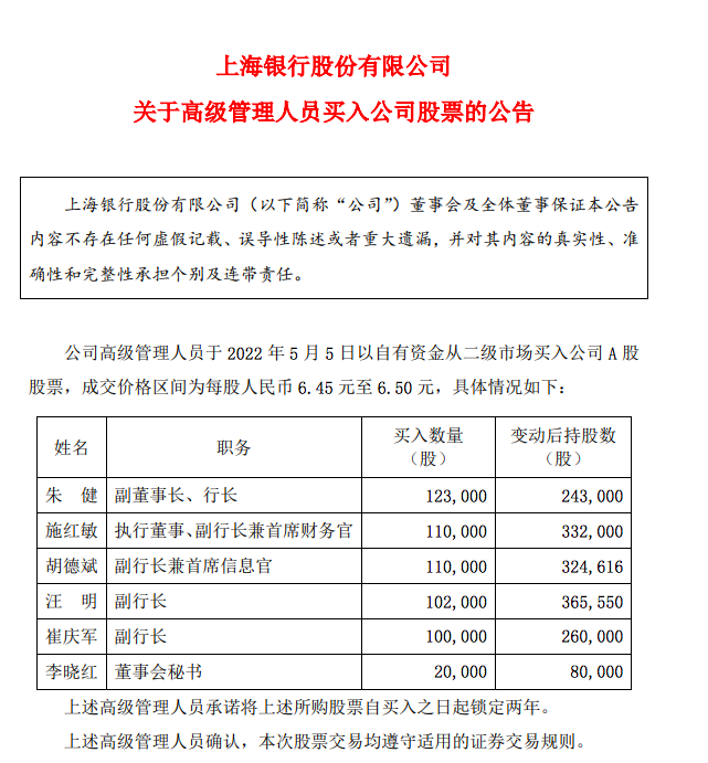 5月6日,上海银行发布的《关于高级管理人员买入公司股票的公告》显示,上海银行高管层于2022年5月5日以自有资金从二级市场买入上海银行A股股票,成交价格区间为每股6.45元至6.50元,共计买入56.5万股股票。