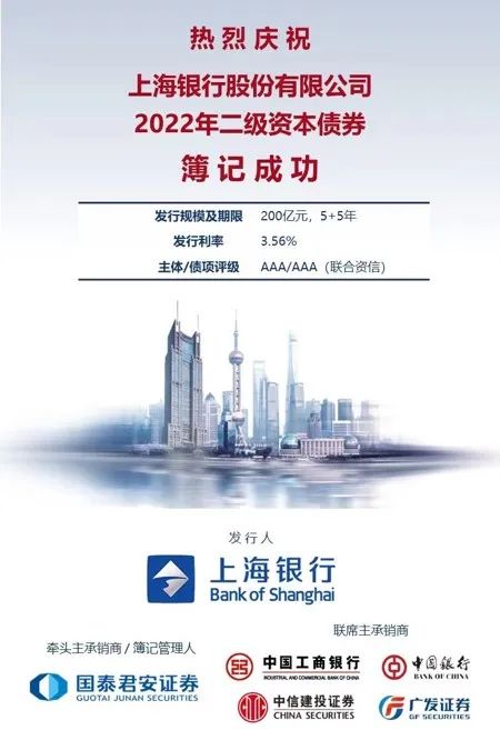 2022年7月6日,上海银行股份有限公司(简称上海银行)通过上海清算所在全国银行间债券市场成功发行200亿元人民币二级资本债券,期限为5+5年期,票面利率3.56%。簿记当日,市场认购踊跃、投资者类型丰富,全场认购倍数达到2.3倍。