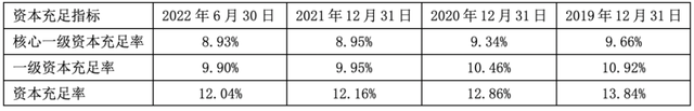 此外,该行资本充足率指标均有所下降。截至2022年6月末,该行核心一级资本充足率、一级资本充足率、资本充足率分别为8.93%、9.90%以及12.04%,较上年末分别下滑0.02个百分点、0.05个百分点以及0.12个百分点,