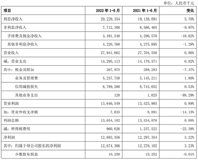 半年报显示,2022年上半年,上海银行实现营业收入279.42亿元,同比微增0.86%,其中利息净收入同比增长5.70%;实现归母净利润126.74亿元,同比增长3.23%。