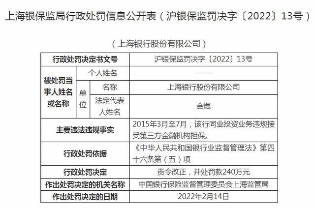 今年2月23日、24日两日,上海银行接连收到来自上海银保监局和深圳银保监局的两张罚单。据行政处罚决定书显示,上海银行股份有限公司因在2015年3月至7月,其同业投资业务违规接受第三方金融机构担保,被处罚款240万元。另一份罚单因涉及到上海银行深圳分行因贷款“三查”不尽职,贷款资金被挪用,被处罚款60万元。