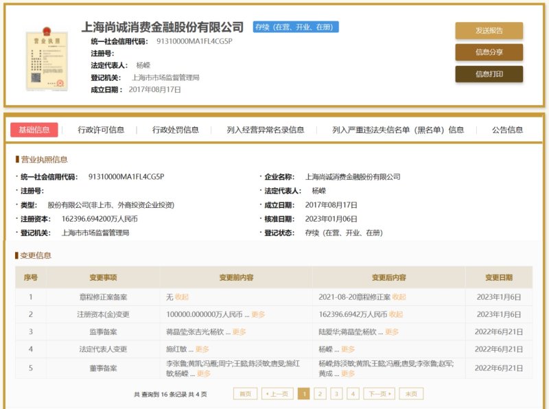 1月6日,国家企业信用信息公示系统显示,上海尚诚消费金融股份有限公司(下称“尚诚消金”)发生工商变更,注册资本从10亿元,增至约16.25亿元。增资后在行业中仍属于中等靠后的位置。